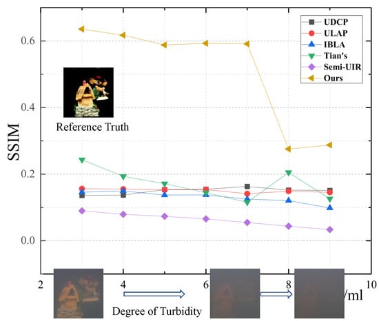 Furthermore, We also tested the robustness of our method in environments with varying degrees of turbidity. We evaluated the restoration performance of our approach in waters of different turbidity levels using the underwater color image quality evaluation (UCIQE) and the structural similarity index (SSIM) [30] as quality metrics. SSIM, which mimics the human visual system to measure the structural similarity between two images, is a widely used reference-based index. We used images captured in clear water as the real image reference. The restoration results, as shown in Figure 6 and Figure 7, demonstrate that our method outperforms others across various turbidity levels. However, our method has limitations; when the water reaches a certain level of turbidity, the quality of our restored images rapidly deteriorates.