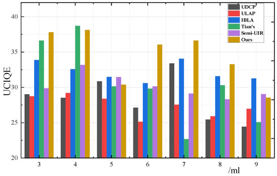 Comparison of restoration results using the UCIQE scores corresponding to Figure 5.