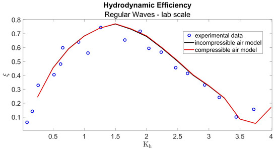 Hydrodynamic efficiency of a laboratory-scale OWC. Comparison between experimental measurements by [3] (circles), numerical results obtained by the proposed compressible air model (red line), and those obtained the incompressible air model (black line).