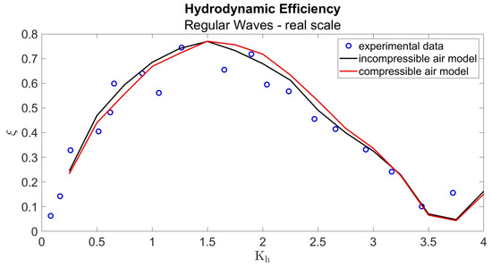 In order to evaluate the effect produced by air compressibility on real-scale OWC performances, in Figure 2, we show the results of a further set of numerical simulations that were carried out by numerically reproducing the real-scale OWC from which the scale model used in the laboratory tests was taken. In those real-scale numerical simulations, the OWC dimensions and the characteristics of the input waves were obtained from the laboratory-scale ones by using the well-known Froude similitude laws. In this way, we numerically simulated the performances of a real-scale OWC subjected to regular waves with a wave height of and a variable wave period between and . These simulations were carried out both by the proposed model (which takes into account the air compressibility) and by the simplified one (in which the air is assumed to be incompressible). As can be seen from Figure 2, the transition from the laboratory-scale dimensions to the real-scale ones involved differences in the numerical results obtained by the two different models that were no longer negligible. In this case, the differences in the OWC’s hydrodynamic efficiency produced by the two different models were approximately 5%.