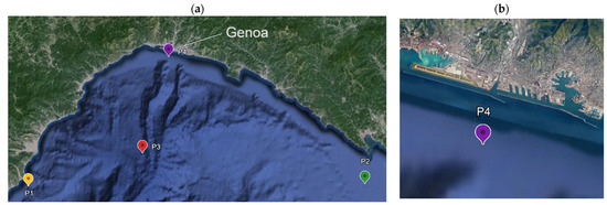 Full (a) and detailed view (b) of the Gulf of Genoa. Point P1: buoy of Capo Mele; point P2: buoy of La Spezia; point P3: reconstructed data point by reanalysis; point P4: starting point of the numerical simulations carried out by the proposed model.