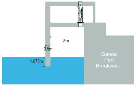 The input waves used for this case study were those belonging to the origin wave sector, , with a frequency of occurrence greater than and a significant wave height of . We assumed that the OWCs were located on the offshore side of the breakwater, for a total length equal to , and that the chamber width was equal to , the chamber height was equal to , and the front wall draught was equal to (Figure 5). The water depth at the OWC entrance was set equal to , which is the mean water depth at the base of the considered breakwater. The geometry of the breakwater (parallel to the coast) and the direction of the incoming prevailing waves (perpendicular to the breakwater) allowed us to simulate, by a 2D model, just a 1 m wide vertical cross-section of the breakwater and to extend the numerical results to the whole length of the considered breakwater ().