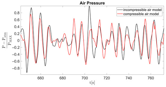 Genoa port case study. Time evolution of non-dimensional air pressure inside the OWC chamber. Numerical results obtained by the compressible air model (red line) and incompressible air model (black line). ; ; .