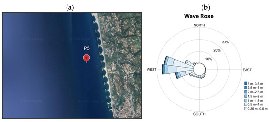 (a) Coast of Paola and location of point P5. (b) Wave rose diagram of mean annual significant wave heights at point P5.