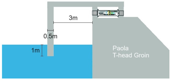 For this case study, the chosen waves were those coming from the sector with a frequency of occurrence greater than and a significant wave height of . The OWC was located on the offshore side of the head of the T-groin, had a chamber length equal to 3, and had a front wall draught equal to (Figure 8).