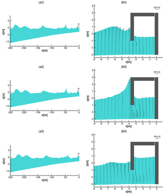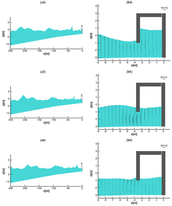 Coast of Paola case. Interaction between OWC and irregular waves with significant wave height of and peak period of . Sequence of instantaneous wave fields (a1–a6) and detailed view of flow velocities (b1–b6).
