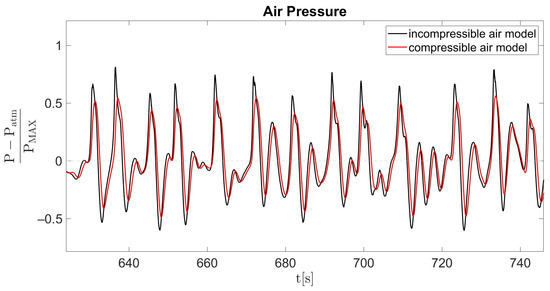 An example of these differences in pressure values inside the chamber is shown in Figure 6, which compares the time evolution of the air pressure in the chamber obtained by both the compressible and incompressible air models during the numerical simulations of the interaction between the OWC and irregular waves with a significant wave height of and a peak period of . For the sake of clarity, the pressure values shown in Figure 6 were non-dimensionalized by dividing them by the maximum pressure value found during the simulation (). In this figure, it is possible to see that higher pressure peaks (in absolute values) were obtained by the incompressible air model and that the maximum differences between the two models were almost 40%. The graph also shows that, during the numerical simulations, the absolute value of the pressure calculated by the incompressible air model was not always higher than the one calculated by the compressible air model. The presence of time intervals in which the opposite result takes places explains why the resulting mean annual energy obtained by the incompressible air model was only 8.56% higher than that calculated by the compressible air model.