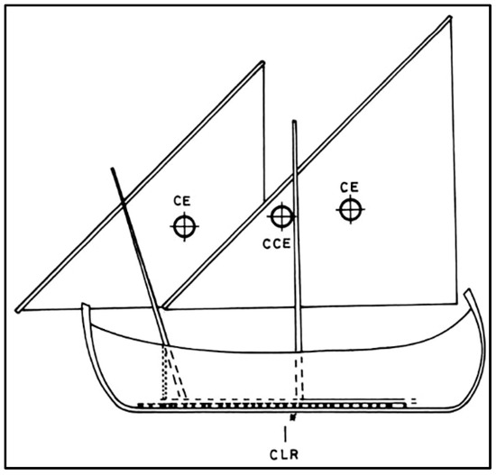 In deriving an alternative sail plan, the authors resourced the archaeological reconstructions of the hull, keelson, and keel [1]. Hence, the mast step was assumed to be located vertically aligned with the center of least resistance (CLR), slightly forward of the center of effort (CE). This fundamental design concept, which ensured minimal weather helm, has been employed by ancient shipwrights and contemporary marine architects alike [4,5]. This basic architectural principle served the authors in locating the mast step.