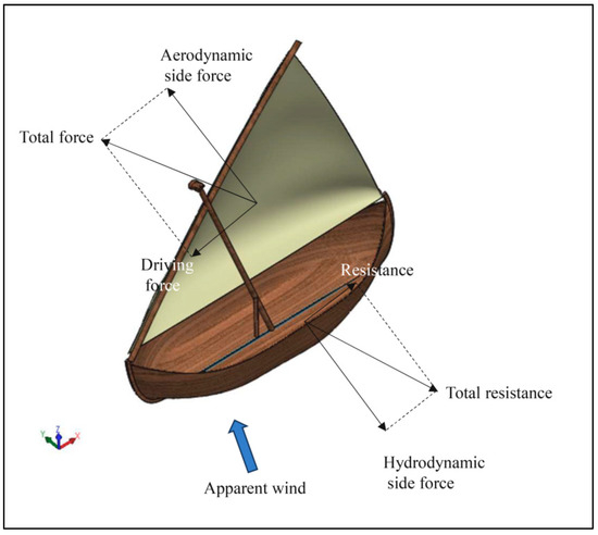 When possible, an analytical methodology was implemented. This involved initially solving a given formula or equation to arrive at a calculated value. This was indeed valuable in setting orders of magnitude and a generalized direction to complex problems of fluid dynamics. The solution was verified by applying numerical analysis, which iteratively ‘converges’ on the solution of a fixed value [7]. This method was particularly useful in modeling the CFD aerodynamic analysis of the sail forces where more detailed and specific aerodynamic input parameters were required [8]. The forward movement sailing vessel, rigged with a single lateen sail, is dependent on the forward thrust propulsion system of the vessel. The forward thrust of the vessel relies on the capacity of the sail to develop the power to overcome the wave and hull-side resistance forces, as illustrated in Figure 2.