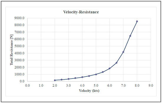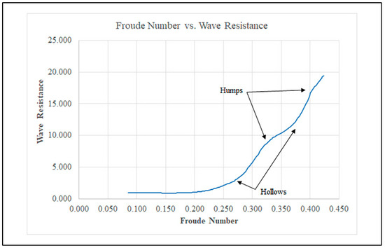 A related input value when calculating the resistance on the hull is the generation of waves caused by the longitudinal motion of the vessel in the water. This can be simplified by assuming that the water is moving and that the hull is stationary. The flow around the hull would be the same as if it were moving over still water [5]. As the speed increases, the resistance increases exponentially (Figure 4). Longer wavelengths are generated along the hull, while concomitantly, the phenomenon of wave interference occurs. If the crests of the bow and stern coincide, large waves result. If the bow wave crests coincide with the troughs of the stern, wave attenuation occurs [11]. This is expressed in the Froude number (Equation (2)), which was employed when conducting a resistance analysis on the digital model of the Serçe Limanı. The resistance was relative to diverging hull wave amplifications and attenuations; the ‘humps and hollows’ are indicative of this phenomenon (Figure 5). The dimensionless value is expressed in Equation (6)