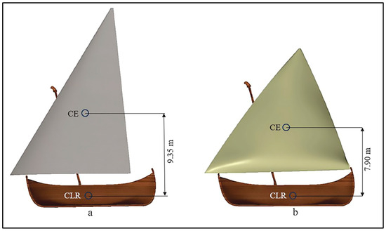 Determining the shape of a medieval sail is problematic [2]; hence, as a single sail configuration, two different triangular-shaped sails were proposed for CFD aerodynamic velocity-pressure simulations: one resembling a right-angle triangle and the other, a scalene triangle. In rigging the sails, care was taken in the design of the sails to place the CE forward of the CLR to reduce weather helm (Figure 6).