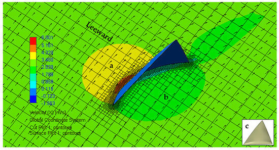 Figure 7. Power analysis of the scalene triangle sail displaying mesh and pressure differentials consistent with forward propulsion: (a) high velocity (low pressure); (b) low velocity (high pressure); (c) thumbnail of scalene triangle sail (Illustration: N. Helfman).
