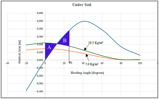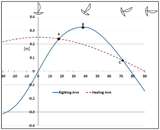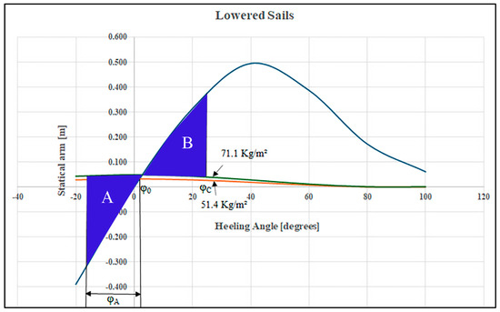 In both evaluations, area ‘A’ must be equal to area ‘B’, where φ0 = the vessel’s angle of heel under the influence of the stationary wind load with lowered sails, φA = the roll amplitude due to a resonant roll movement caused by the wave load, and φC = the vessel angle of heel due to a gust [16]. The calculations performed demonstrated a high degree of stability based on the NerRF standards, such that φA = 17.68°, φ0 = 2.00° < 20°, φC = 23° < 45.00°, φC = 25.6° < 50.00°.