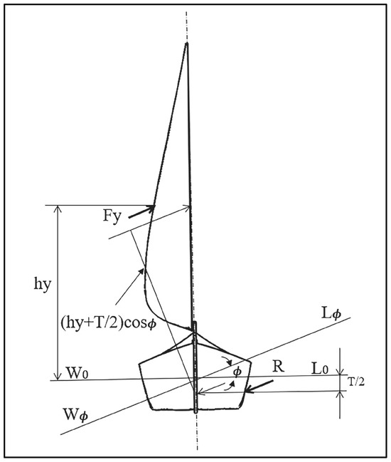 The calculation of the heeling arm relates to force Fy = pyAy, where py is the wind pressure, and Ay is the area of the sail (Figure 9). The force Fy tends to heel and drift the ship but is opposed by force R, which is equal to Fy. R acts at the half-draft T/2, where torque is developed until the heeling moment equals the righting moment. The heeling arm varies with the heeling angle where the area exposed to the wind varies proportionally to cosϕ parallel to the inclined plane WθLθ and is expressed in the Equation (11):