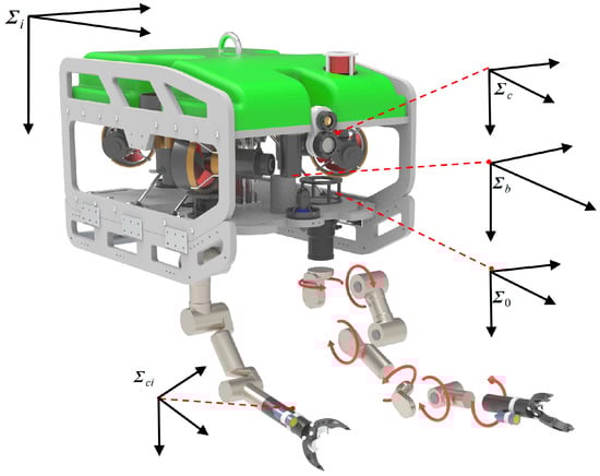 Modeling the UVMS dynamics is challenging, as it requires consideration of both the impact of the water and coupling effects between the manipulators and the vehicle. A brief description of the kinematic and dynamic models of the UVMS is provided in [25]. Considering the model in [25], the numerical simulation is executed for the dynamic model in [26], and the coupling between the dual manipulators and the vehicle is analyzed in this work. It is impossible to develop a mathematical model that accurately represents the physical system. Until now, control research of the UVMS mostly uses robust and adaptive tools to solve the model uncertainties. In [24], the model coupling information is estimated by the EKF filter, and the model predictive-based control provides an optimal kinematic solution. In [27], the sliding mode control of the UVMS, with certain anti-interference ability, has been provided for a tracking task. To deal with uncertainties and disturbance, Refs. [28,29] provide the adaptive control strategy and observer-based method, respectively, and both of them show good performance while handling uncertainties.