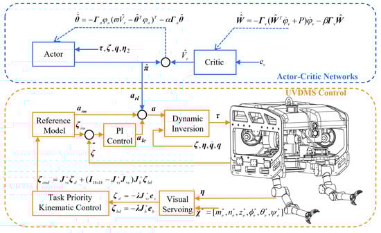 This paper is organized as follows. Section 2 describes the mathematical model of the kinematics and dynamics of the UVDMS, as well as the hybrid visual servo model of the UVDMS. Section 3 formulates the kinematic control that produces the command velocity to be tracked. In Section 3, the reinforcement-learning-based adaptive control is formulated, while the actor–critic networks are designed to compensate for the system uncertainties. And the stability analysis is down in this section. Then, the simulation work using an 18-dof UVDMS is shown in Section 4. At last, in Section 5, a brief summary of this work is provided.