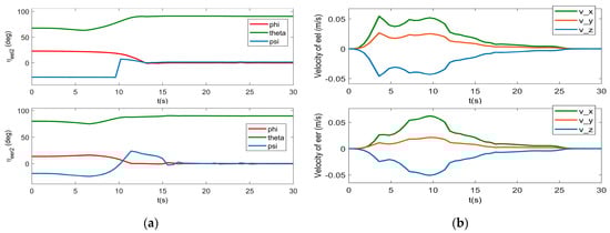 Euler angles and linear velocities of the end effectors: (a) Euler angles of the end effectors; (b) linear velocities of the end effectors.