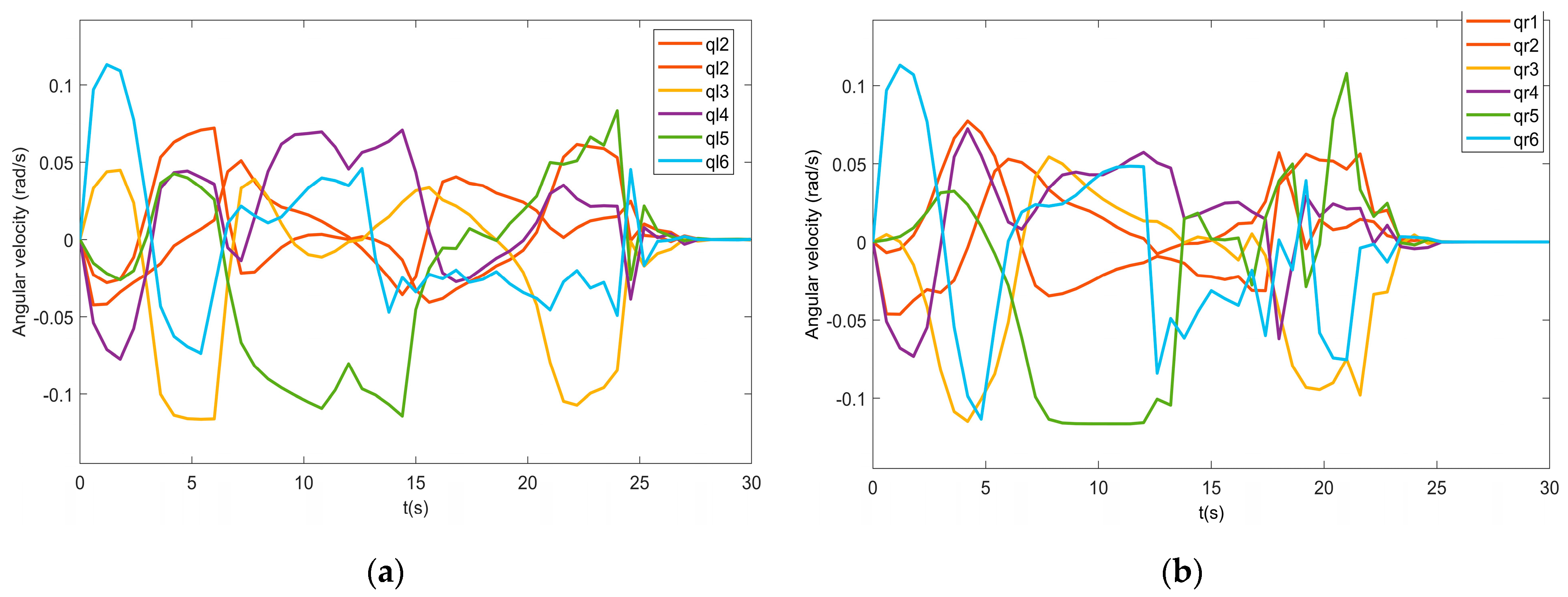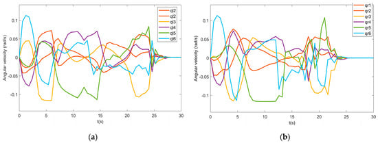 Angular velocities of the manipulators: (a) velocities of the left manipulator; (b) velocities of the right manipulator.