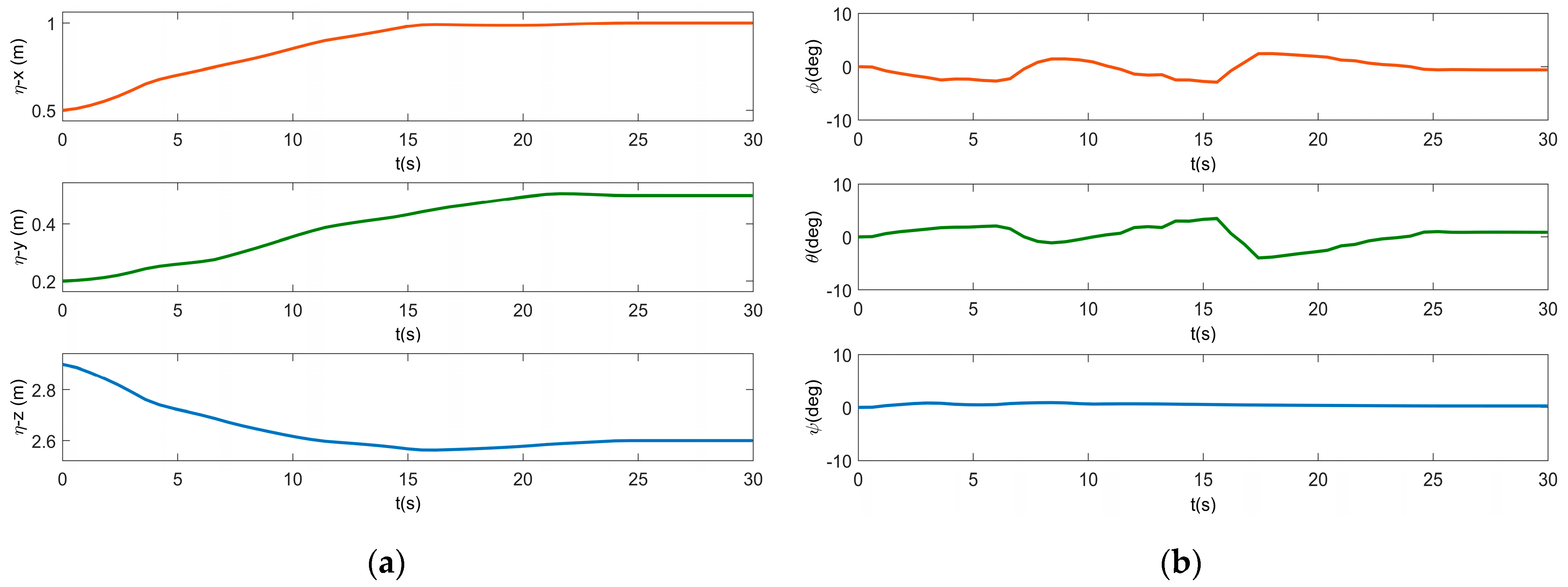 Pose of the vehicle in the inertial frame: (a) the position of UUV; (b) the Euler angles of UUV.