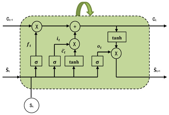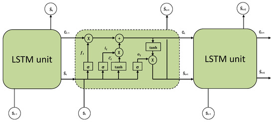 LSTM regulates information flow through the incorporation of a gating mechanism comprising input gates, forgetting gates, and output gates. Central to LSTM is the “cell state,” an internal state capable of reading, writing, and purging information across various time steps in the sequence. The forgetting gate dictates the extent to which information from the preceding cell state is to be discarded or retained in the current cell state . Meanwhile, the input gate determines the incorporation of current input information into the current cell state . Finally, the output gate governs the transfer of information from the cell state to the estimated value for subsequent time steps. The architectural layout of an LSTM unit is shown in Figure 1.