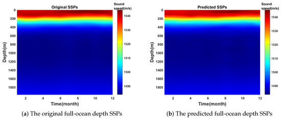 A comparison of the original 12 full-ocean depth SSPs with the predicted 12 SSPs is shown in Figure 7. It can be seen that the 12 monthly averaged full-ocean depth SSPs predicted by the model in the next year are almost perfectly matched with the actual SSPs, and the fitting effect is excellent, accurately reflecting the characteristic information of the actual SSP.