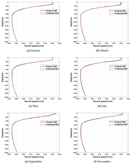 To validate the accuracy of the model’s SSP predictions, sound speed distribution data from the first four complete cycles preceding the prediction start time were extracted from . As an illustration, taking October 2021 as the predicted start time, 48 historical hierarchical sound speed distribution datasets from October 2017 to September 2021 were employed as learning samples for the model. A comparison is shown in Figure 6 between the original and predicted 58-layer sound speed data for selected months in 2021, including January, March, May, July, September, and November.