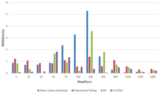 In the mean value prediction method, the maximum prediction error occurs at a depth of 200 m, exceeding 5 m/s. For the polynomial fitting, the prediction error is relatively stable at each depth layer, with a maximum error of no more than 1.5 m/s. However, in most depth layers, errors surpass 1 m/s. Similarly, the BP neural network prediction method exhibits a maximum error at a depth of 200 m, exceeding 3 m/s. Conversely, the proposed H-LSTM neural network prediction method demonstrates significantly smaller prediction errors. The maximum error does not exceed 2 m/s, with only two layers experiencing errors surpassing 1 m/s, and the minimum error falling below 0.5 m/s. In summary, H-LSTM outperforms other methods in predicting future SSPs at full-ocean depth.