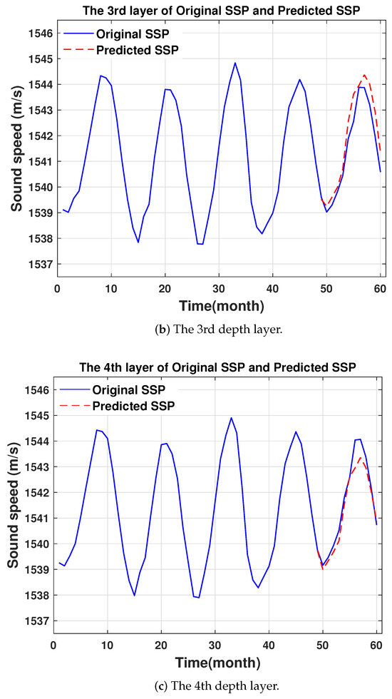 To assess the H-LSTM model’s performance in predicting periodic changes in SSP, we utilized historical SSP data spanning from 2017 to 2020 as learning samples and conducted a 12-step prediction on future SSP data, forecasting SSPs for each month of the next year. We randomly selected the second layer (corresponding to a depth of 5 m), third layer (corresponding to a depth of 10 m), and fourth layer (corresponding to a depth of 20 m) between depth layers 1–58 to test the model’s ability to accurately capture periodic changes in sound speed distribution. The comparisons of the periodic trends of the predicted SSP with the raw SSP data for the second, third, and fourth depth layers are shown in Figure 11.