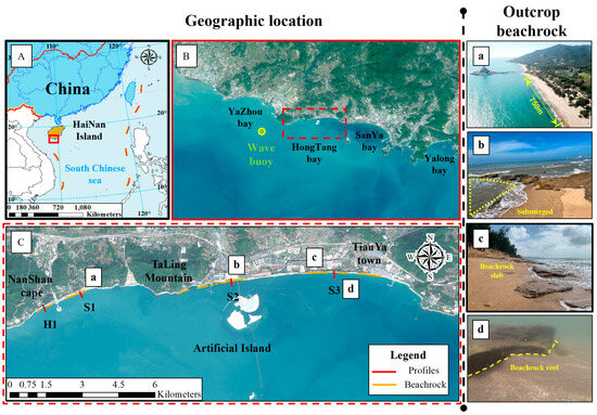 Figure 1. (AC) Location of Hongtang Bay. H1, S1, S2, and S3 are locations of the profile survey. (ad) Positions of exposed beachrock in Hongtang Bay (photos of beachrock were taken in June 2021).