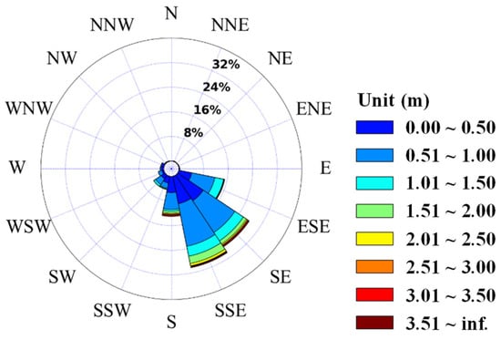 The dynamic environment of Hongtang Bay is generally characterized by weak tides and strong waves, with the advancing tide waves of the South China Sea controlling the flow direction and tidal range changes in this area. The tidal currents in this area are mainly characterized by bidirectional flow, with flood tides flowing to the northwest and ebb tides flowing to the southeast. The average flow speed within a tidal cycle is about 0.2~0.5 m/s, showing irregular daily tides, with an annual average tidal range of 0.79 m and a maximum tidal range of 1.89 m. The rise in tidal level affects the dissipation of incoming waves on the exposed beachrocks in the beach foreland. During low tide, the exposed rock formations can be directly impacted by the waves, while during high tide, they are quickly submerged and become underwater reefs. According to the wave buoy data from outside Hongtang Bay, wind-driven waves dominate in this area, with prevailing waves predominantly concentrated in the ESE~SSE direction, and cumulative frequencies of wave heights below 1.5 m reaching 24%. Strong wave events are oriented toward the southwest (SW), mostly generated by short-term, strong prevailing westerly winds or tropical cyclones moving northward from the South China Sea. Wave heights are concentrated in the range of 1.5~2 m, with frequencies lower than 8% (Figure 2). The wave period is concentrated in the range of 8~12 s and, subsequently, in the summer and autumn seasons, the monsoon predominance gradually shifts to being dominated primarily by wind waves or mixed waves.