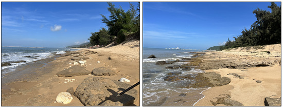 Since 1960, the local shoreline of Hongtang Bay has not shown a significant trend of erosion or accretion, remaining in a long-term stable state [28]. In recent years, coastal engineering construction has been the main factor causing changes in the shoreline of Hongtang Bay. During 2016–2017, the construction of an artificial island in the middle of Hongtang Bay may have altered the original sediment transport pattern of this section of coastline. After the construction of the artificial island, the surrounding shoreline was influenced, resulting in net alongshore sediment transport in areas sheltered by the artificial island. During this period, the sea area where Hongtang Bay is located also suffered from the impact of multiple storm events, resulting in significant local fluctuations in beach erosion and accretion. The major events impacting the beaches of Hongtang Bay were Typhoon “Doksuri” in September 2017 (No. 201719, typhoon number from China Meteorological Administration) and Tropical Storm “Etau” in November 2020 (No. 202022). Short-term, high-energy processes may have locally altered the erosion and accretion patterns of the local shoreline in Hongtang Bay. In these erosive environments, the loss of sediment from the beach surface has led to the gradual exposure of beachrocks that were originally buried beneath the beach (Figure 3).