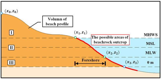 Considering the differences in the exposure positions and coverage ranges of beachrocks at different shore sections in Hongtang Bay, and to standardize the quantification of erosional features of beach profiles in different periods, this study divided beach profiles into three zones based on tidal characteristics: the supratidal zone (Zone I: above mean high-water spring (MHWS)), the intertidal zone (Zone II: between MLW and MHWS), and the subtidal zone (Zone III: 0 m contour to MLW; Figure 4). The corresponding beach single-width volume can be calculated by integrating the corresponding nodes.