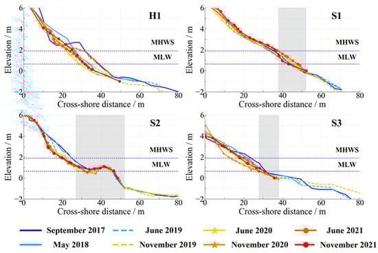 Figure 6. Evolution features of beach profiles in different sections during the monitoring period (gray-filled area indicates the region covered by exposed beachrocks).