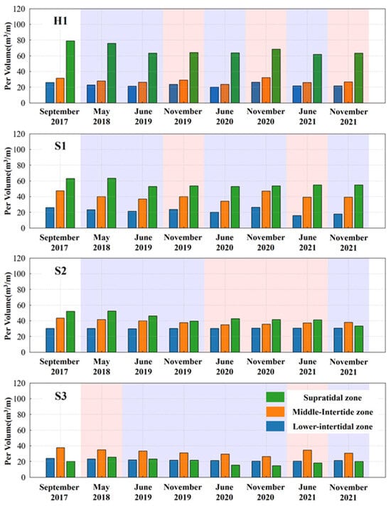 Figure 7. Changes in the single-width volume of different zones in various beach profiles during the monitoring period (color-filled with features of accretion compared to the last observation, with red indicating accretion and blue indicating erosion).