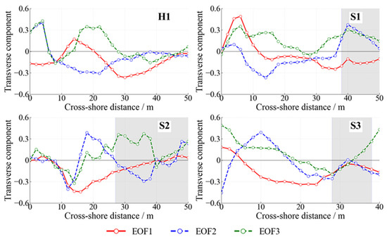 Figure 8. Spatial modes of beach profiles in different sections during the monitoring period (gray-filled areas indicate regions covered by exposed beachrock).