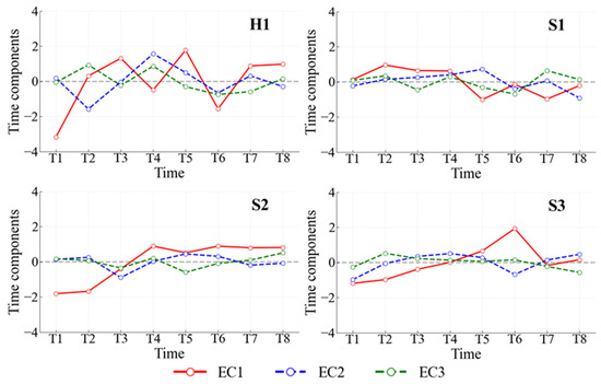 From the perspective of the time modes, the erosion trends of each profile were not very apparent (Figure 9). Although there may be seasonal variations in erosion in the T4~T8 periods, further analysis may be needed to determine whether there were regressive features of seasonal erosion trends. In terms of trend changes, the first time-mode fluctuations of the H1 profile were more significant compared to the S1~S3 profiles. Additionally, during the T3~T6 period, it exhibited significant alternating seasonal erosion features. In contrast, the changes in the S1~S3 profiles were not as pronounced. This suggested that the profiles with exposed beachrock exhibited a lag in response to dynamic environmental conditions, allowing them to maintain a relatively stable state over the long term.