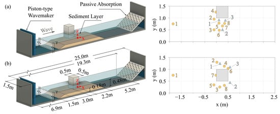 Wave- and/or current-induced equilibrium scour around slender cylindrical structures has been extensively studied [,,,,,,,,,,,,,,,,,] due to its relevance to a wide range of applications such as offshore wind farms in the renewable energy industry and bridges in the transportation sector. Studies on the equilibrium scour of slender square structures under different flow conditions have also been conducted [,,,]. However, knowledge on wave-induced non-equilibrium scour processes around non-slender structures remains limited due to lack of conclusive data. Non-equilibrium scour is a constantly evolving scour pattern, as erosion and accretion are not in equilibrium. Various factors contribute to non-equilibrium scour, including changes in flow velocity, sediment size distribution, and turbulence intensity. It is commonly observed during transient flow conditions such as waves, storm-driven floods, or tidal fluctuations. Understanding non-equilibrium scour is essential for the design and maintenance of infrastructure, as it can lead to significant alterations in the bathymetry around structures, posing risks to their stability and safety. Therefore, investigating and predicting non-equilibrium scour processes is crucial for risk mitigation and the integrity of coastal and hydraulic structures. Recent field investigations have shown that wave-induced scour around beachfront structures is highly dependent on the structure’s size and placement within an array [,,]. Although these investigations provide insight into the scouring process during extreme overland flooding events, they do not contribute significantly to the accurate prediction of non-equilibrium scour around beachfront structures.
