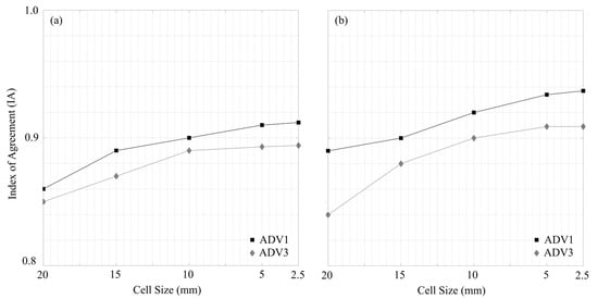 The index of agreement (IA) metric [] was employed to measure the accuracy of the simulations. IA accounts for phase disagreements, where IA = 1 and IA = 0 indicate perfect agreement and disagreement, respectively. To that end, the mesh was refined until the calculated IA for the measured versus computed horizontal velocity components, , remained relatively unchanged (Figure 2). Mesh independence was achieved at a minimum cell size of 2.5 mm for both models. The center layout yielded the same results as the side layout.