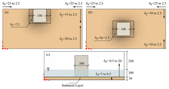 Figure 3 illustrates the final mesh structure utilized in the NWF. The largest cell size on the  plane was 25 mm, which was gradually refined to a smaller cell size near the structure. The optimal cell size of 2.5 mm, as determined from grid sensitivity analyses, was employed in the refinement area marked by a dashed rectangle (Figure 3). Moreover, the region spanning from  = 0.33 m to  = 0.30 m underwent further refinement from 5 mm to 0.5 mm to achieve a more precise prediction of scouring.