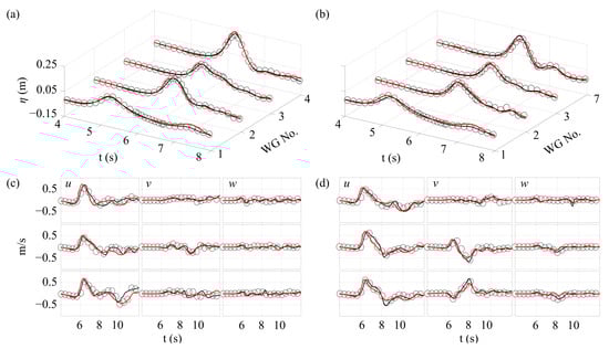 Comparison of measured (gray circles) and computed free surface elevations () and velocity components: (a–c) side; (b–d) center layout. Red and black solid lines represent SedWaveFoam and FLOW-3D results, respectively.
