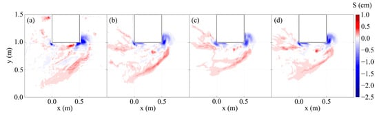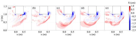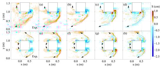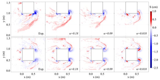 Figure 5 shows the comparisons of the measured and predicted bed elevation () using three different entrainment parameters ranging from  = 0.018 (default) to  at a particular time instant ( 15 s) as an example. The predicted bed elevations for both layouts did not align well with the experimental results when the recommended value of the entrainment parameter,  = 0.018, was employed. Of the parameters tested,  was found to provide the best outcome based on the comparison of the scour and deposition patterns as well as the maximum scour depths for both layouts (Figure 5).