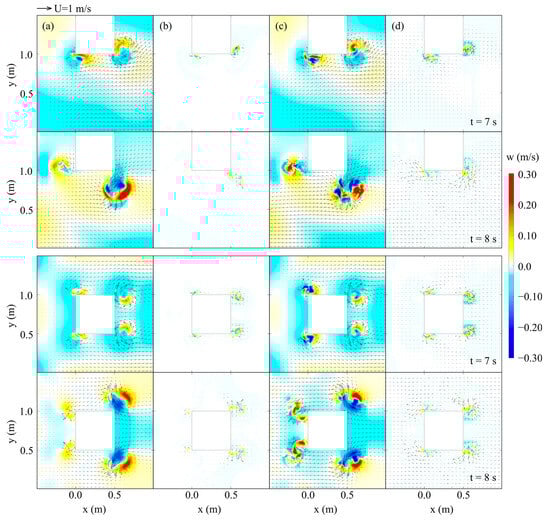 In Figure 8, we observe the spatial distributions of the instantaneous surface horizontal velocity, , and the vertical velocity component, , at two different depths:  m above the sandy bed and on the surface of the sandy bed. The most intense vortex motion is observed between  s and  s, shortly after the wave impinges on the structure. The spatial distributions of  and  simulated by both models are quite similar for these time instants. The highest surface horizontal velocities are observed in the area near the vortex cores, which become less intense as the water level rises under the crest of the solitary wave.
