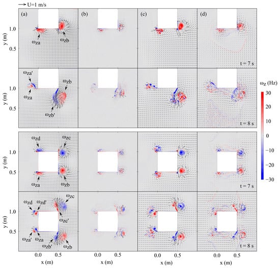 Figure 9 depicts the spatial distributions of the instantaneous surface horizontal velocity, , and the out-of-plane vorticity, , extracted at the two different depths— m above the sandy bed and on the bed surface—at  s and  s. The spatial distribution of  simulated by both models is very similar, where the intensity ranges from −30 Hz to 30 Hz. The clockwise (CW) and counterclockwise (CCW) spinning vorticities at  s—marked with hot and cold colors, respectively—are the vortex doublets (i.e.,  and  and ). For the center layout, a symmetric pattern of vortex pairs is formed on both seaside and leeside, with the structure’s centerline being the line of symmetry. The wake vortices,  and , are found to be larger and more intense than the out-of-plane vortices,  and , that occur at the seaside of the structure. The CCW rotating out-of-plane vortices follow a spiral trajectory for both layouts. On the other hand, the formation of CW rotating vortices, , is attributed to the offshore-directed flow. These vortices adopt a path that is close to a 45° line.
