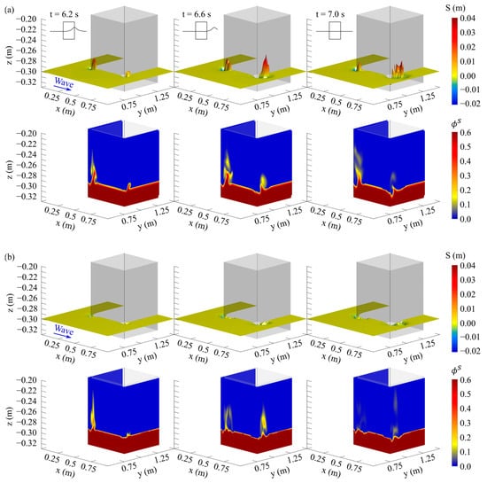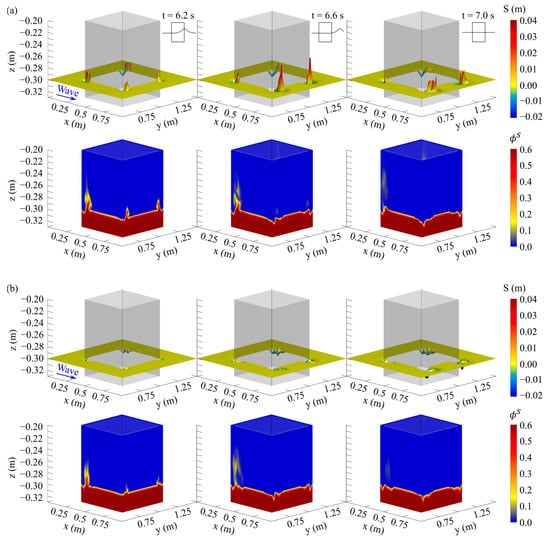 Figure 10 and Figure 11 present the spatiotemporal variation in bed elevation and sediment volumetric concentration ( in the vicinity of the structure for both layouts. Here, the relative position of the bed within each cell is obtained by taking  as 0.5 based on VOF method (Figure 10 and Figure 11—upper panels). The values of  range between 0 and 0.6 since the porosity of the sediment (i.e., the fluid fraction) is 0.4 (Figure 10 and Figure 11—lower panels). As SedWaveFoam solves for the three phases, it treats sediment as a single separate phase in addition to air and water phases. Therefore, the instantaneous “spikes” () in Figure 10a and Figure 11a (upper panels) represent suspended sediment, which is included in the predicted bed elevation. FLOW-3D, on the other hand, employs the quadratic law of bottom shear stress and Equations (14)–(17) to estimate the bed load and suspended sediment concentration and generates separate outputs for bed elevation and sediment transport modes. Consequently, the FLOW-3D output does not reflect any instantaneous “spikes” (Figure 10b and Figure 11b).
