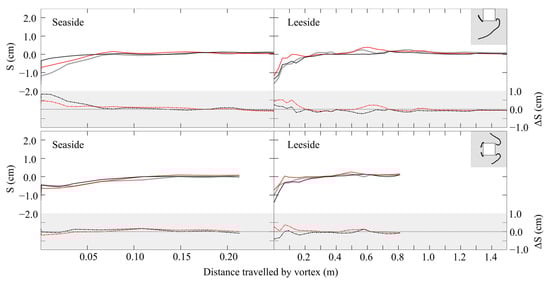 The instantaneous bed elevation along the vortex trajectories at  s, extracted from the measured final bed elevation, for both seaside and leeside of the structure is plotted in Figure 13 for both layouts. The inconsistencies between the predicted and actual bed elevations,  are calculated by subtracting the actual bed elevation from those simulated by the two models. The shaded panels in Figure 13 present , where the dashed red and black lines represent the deviation of the SedWaveFoam and FLOW-3D simulations from the measurements, respectively. The scour induced by both out-of-plane and wake vortices is followed by areas of mild deposition along the vortex trajectories. The vortex effect on the bottom is inferred by comparing the scour depth for both layouts. The near-bed vorticity is relatively higher for the side layout (Figure 9), leading to deeper scour holes both at the leeside and seaside of the structure. SedWaveFoam slightly overestimates deposits along vortex trajectories for both layouts. FLOW-3D, on the other hand, performs better in predicting deposits beneath the vortex paths at the structure’s seaside for both layouts; however, the deposits towards the structure’s leeside are underestimated for the side layout. Both models fail to accurately predict the vortex-induced scour, which is most noticeable at the structure’s seaside for the side layout.