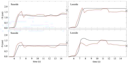 Temporal evolution of maximum scour depth at seaside and leeside of the structure. Upper panels: side layout. Lower panels: center layout. Red and black lines represent SedWaveFoam and FLOW-3D results, respectively. X represents the measured maximum scour depth.