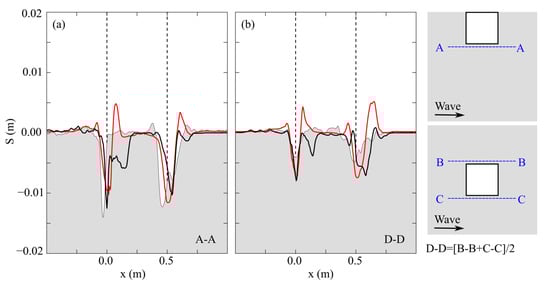 Cross-sectional view of sandy bed along line A–A and D–D at  15 s: (a) side layout; (b) center layout. Gray, red, and black solid lines represent measurement, SedWaveFoam, and FLOW-3D results, respectively. Gray dashed line represents the structure.
