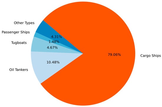 A comprehensive statistical analysis was performed to quantify the contributions to carbon emissions by various ship types in the designated research area, with the findings depicted in Figure 3. The analysis revealed that cargo ships are the predominant source of emissions, constituting 79% of the total. Oil tankers were identified as the next most significant contributors, accounting for 10% of emissions. Additionally, tugboats, passenger ships, and vessels of other classifications were responsible for 5%, 2%, and 4% of emissions, respectively.