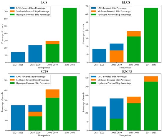 In different scenarios, the progress of adopting alternative fuels for propulsion type varies by vessel. To achieve the dual carbon targets of the shipping industry, some scenarios will accelerate the adoption of hydrogen-powered fuels. The specific emission reduction pathways for each scenario are outlined in Table 6. The percentages presented in the table indicate the proportion of each voyage type within the respective vessel category.