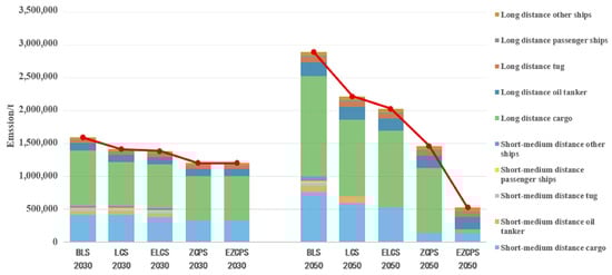 The short-term and long-term CO2 emissions from vessels under different scenarios are illustrated in Figure 7. In the short term, prior to 2030, considering the maturity of low-carbon and zero-carbon fuel technologies, along with the level of supporting infrastructure, the emission reduction measures implemented in each scenario are relatively moderate. Consequently, there is no significant decrease in CO2 emissions under the four emission reduction scenarios by 2030.